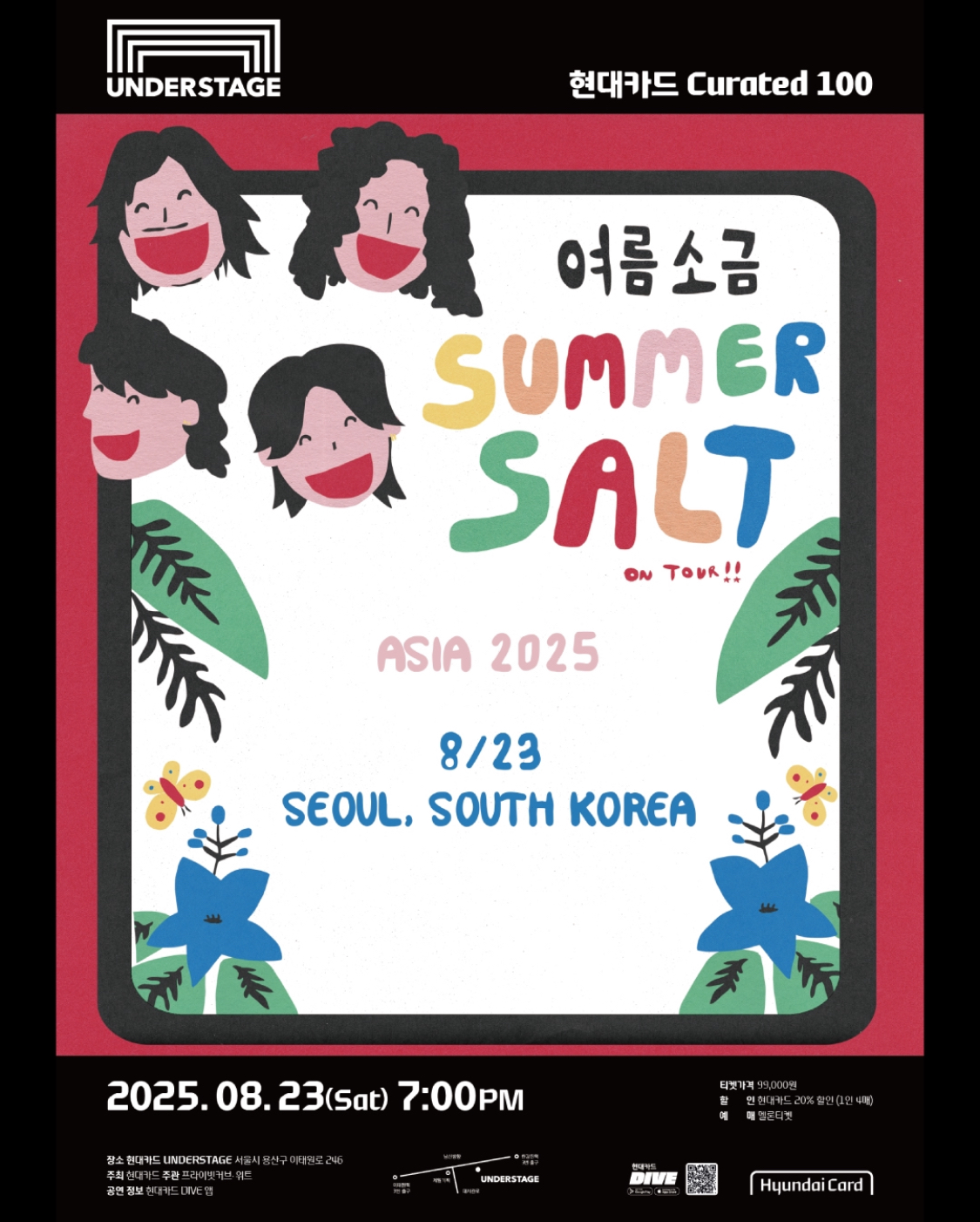 이번 내한은 특히 날짜 선정이 탁월합니다. 무더위도 추억이 되기 시작하는 여름의 막바지, 지금이 서머 솔트의 라이브를 즐기기 최적의 시기인 듯해요.⛱️ 또 한 가지 반가운 점은 공연 장소가 현대카드 언더스테이지라는 점입니다. 무대 뒤편에 바가 있어 음료와 함께 공연을 즐길 수 있기 때문인데요. 맥주나 칵테일을 홀짝이며 서머 솔트의 라이브를 들으면, 여름의 찝찝함은 날아가고 낭만만이 남을 것만 같아요.🍹🫧 덧붙여 지난 내한에 이어 오프닝 밴드로 공연을 열어줄 지소쿠리클럽도 기대됩니다.
